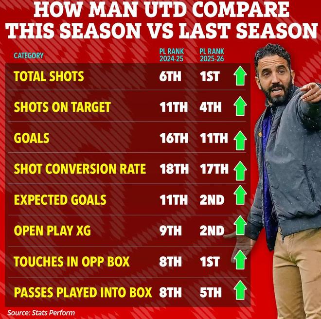然而,从本赛季的前四场比赛来看,曼联在射门和进入对方禁区的触球次数上领跑联赛,在射正、预期进球和进入对方禁区的传球次数上位列前五。