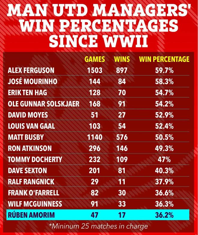自阿莫林上任以来,曼联在英超联赛中的积分创下了英超时代的新低,31场比赛仅得31分。阿莫林的胜率是二战以来曼联所有主帅中最低的。